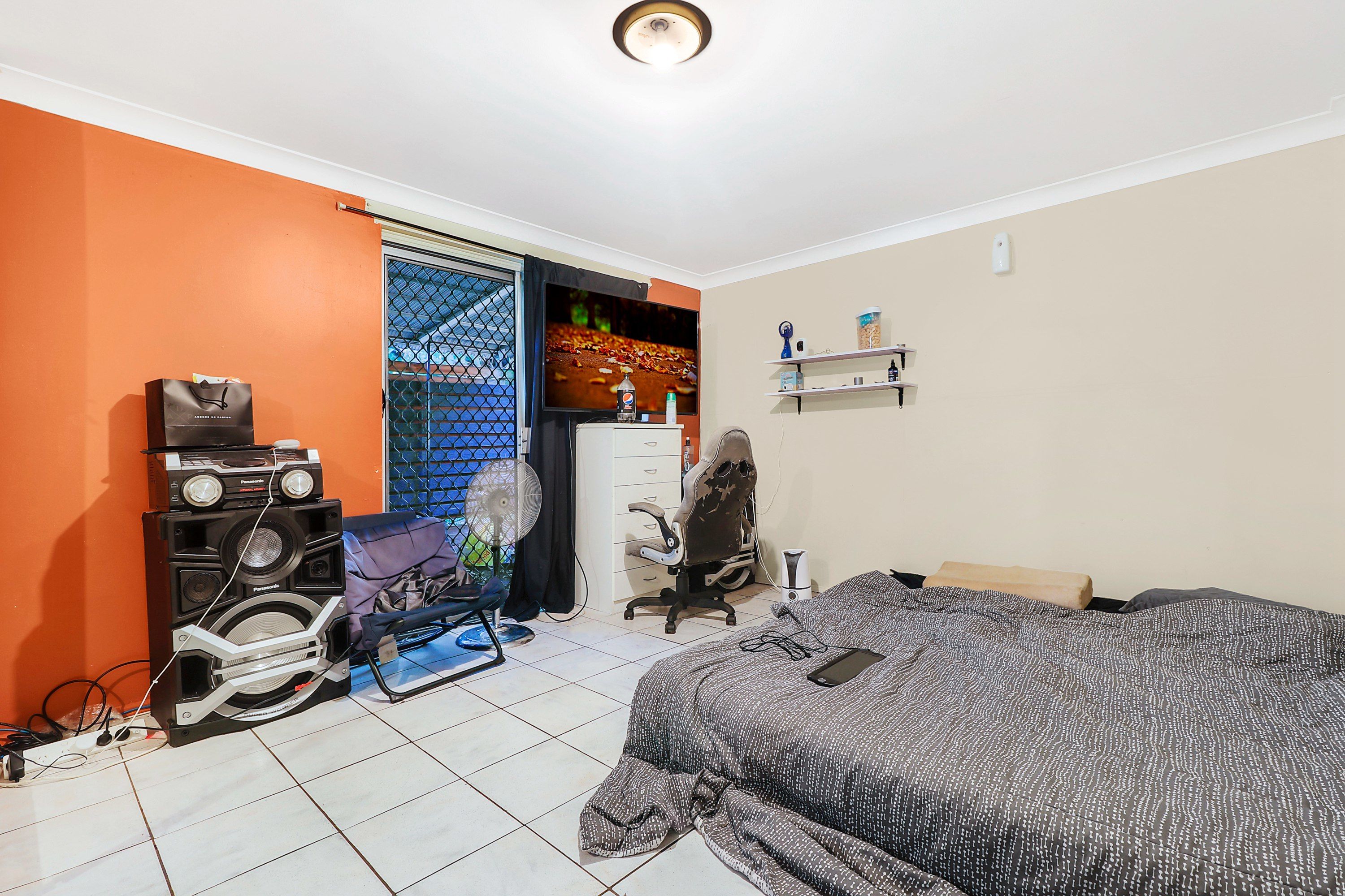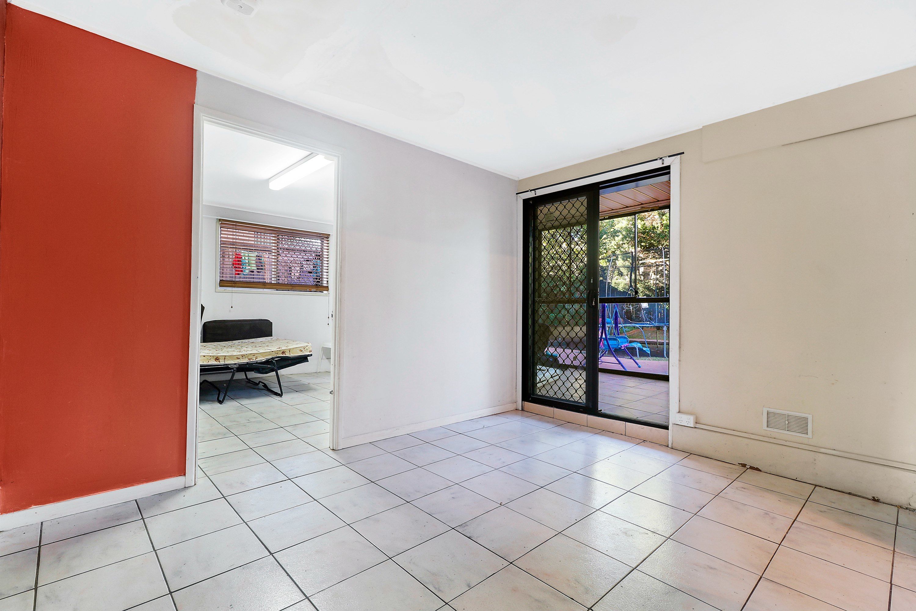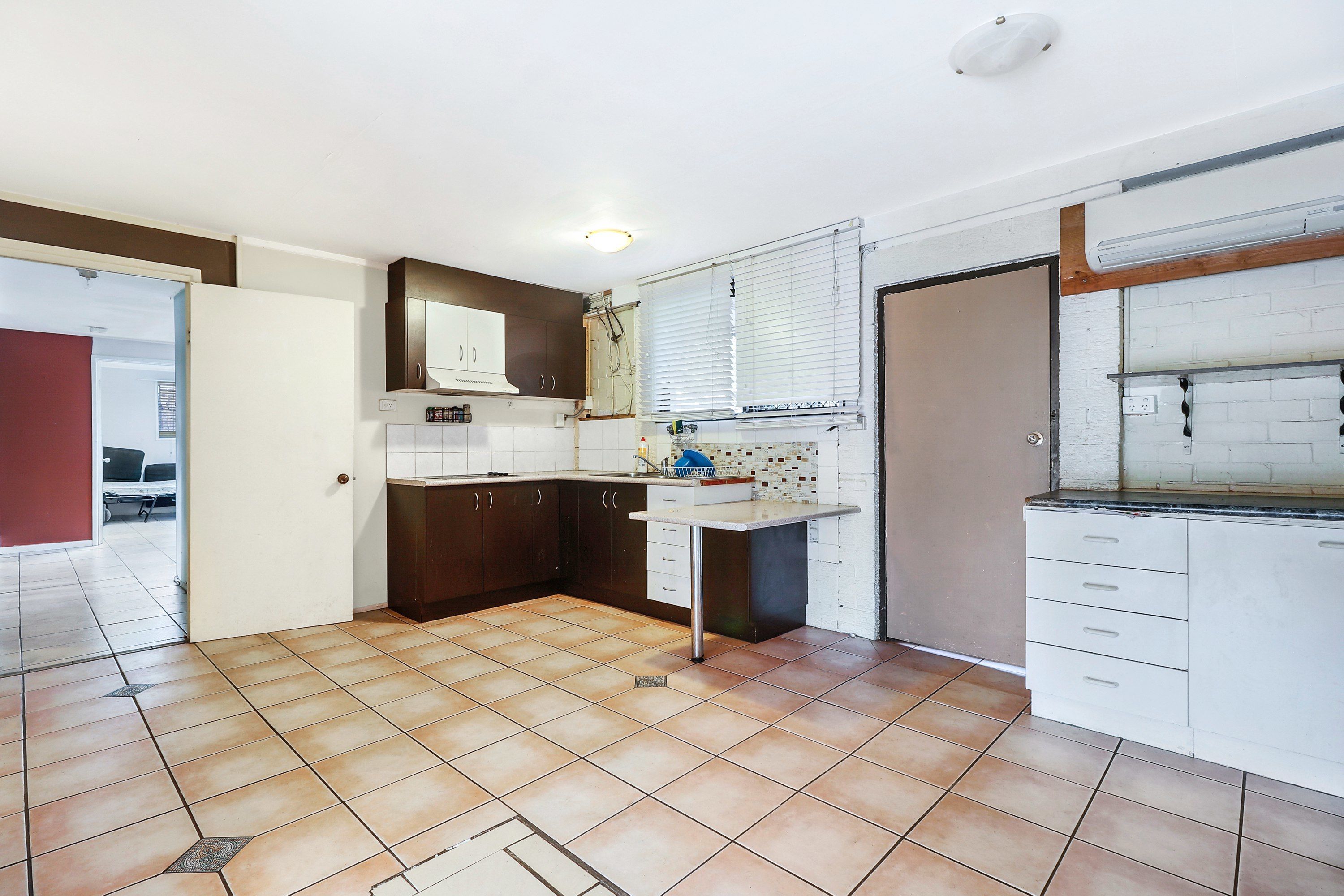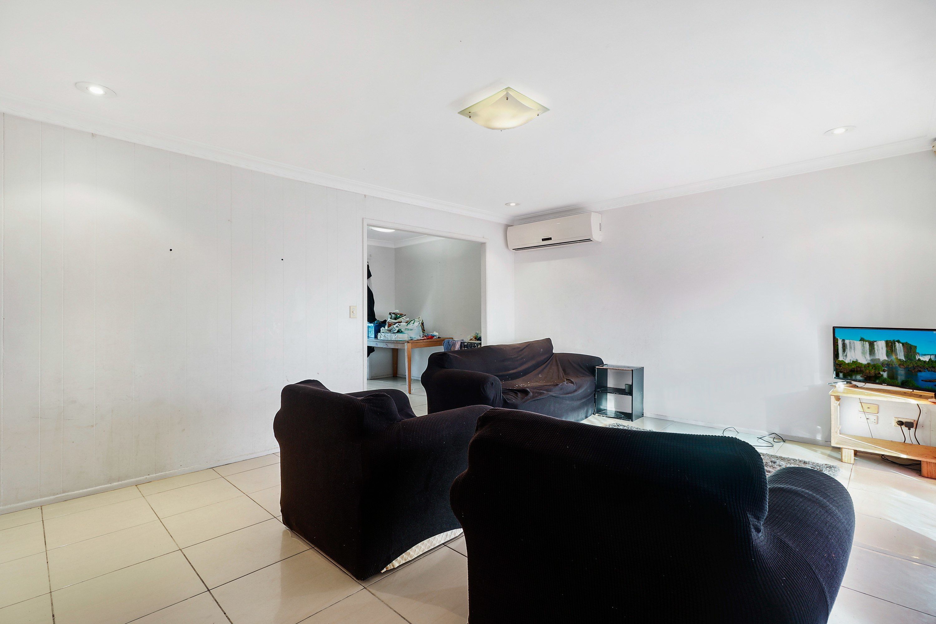 Positioned off the living area are a bathroom and three well-sized bedrooms with built-in storage, including one with air-conditioning and a second with balcony access.