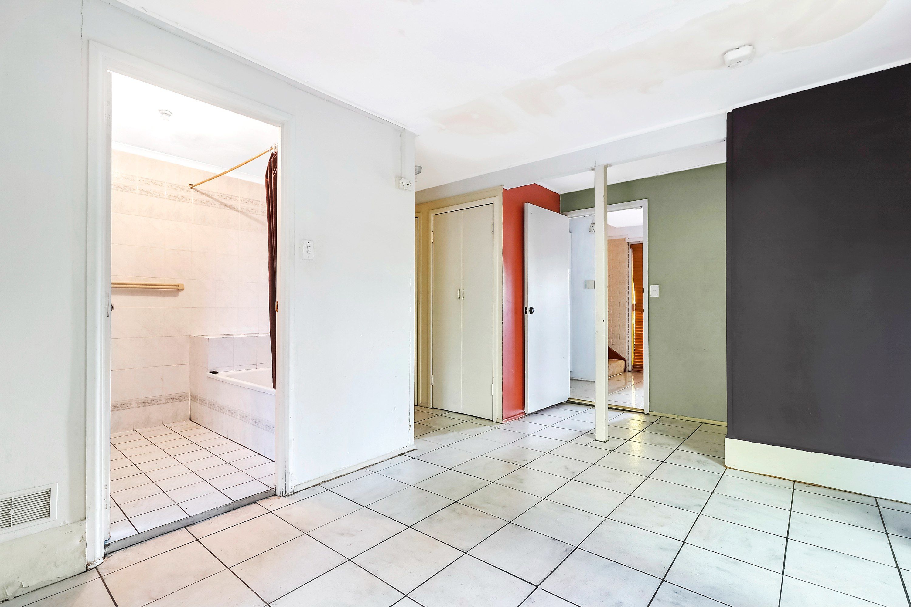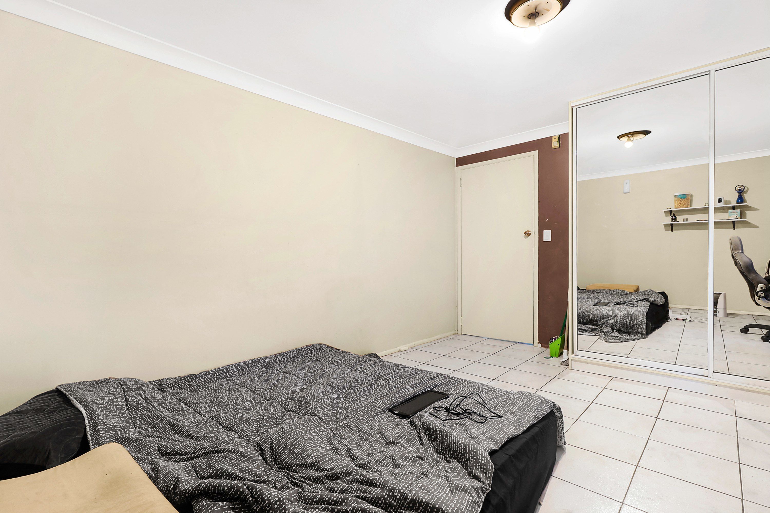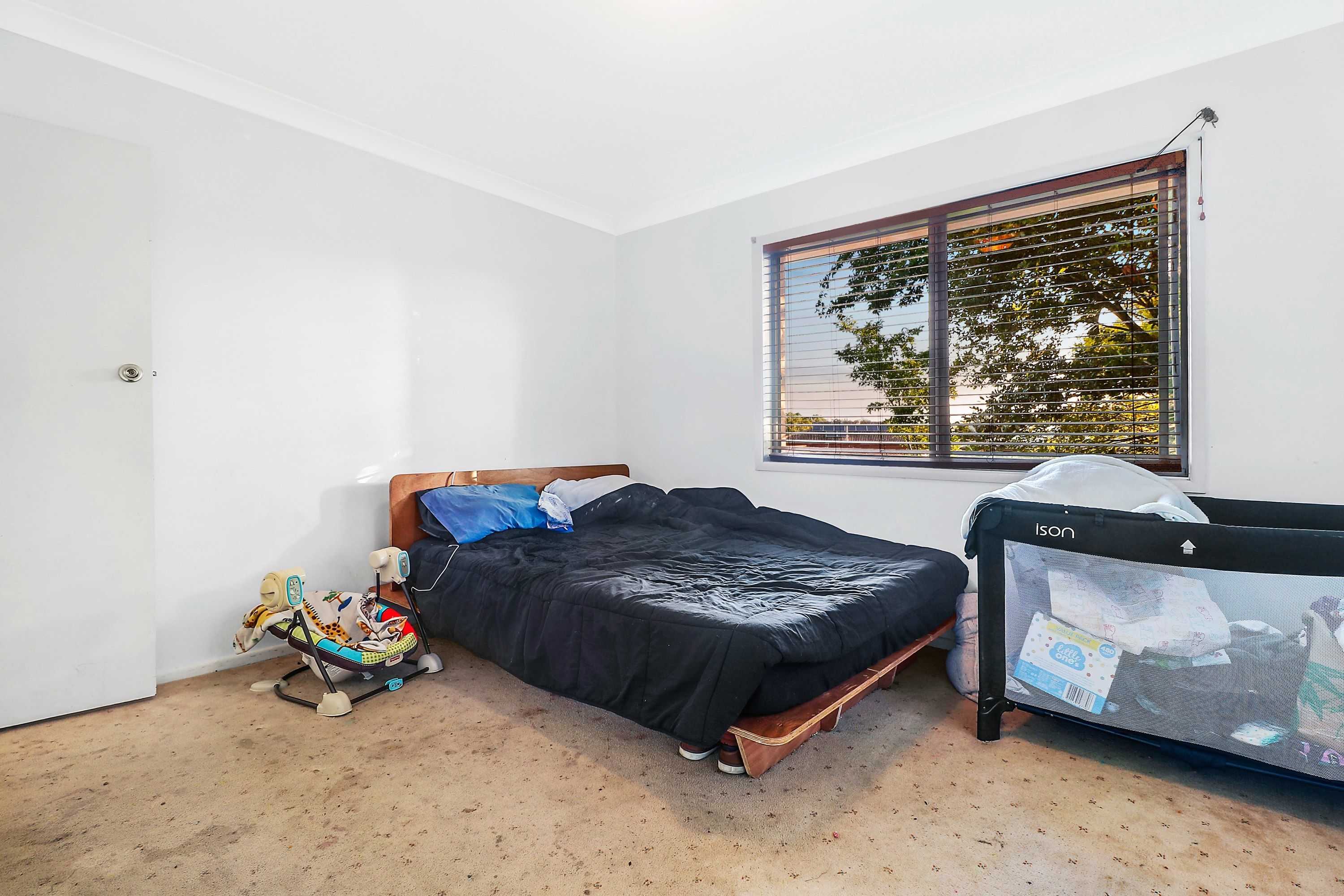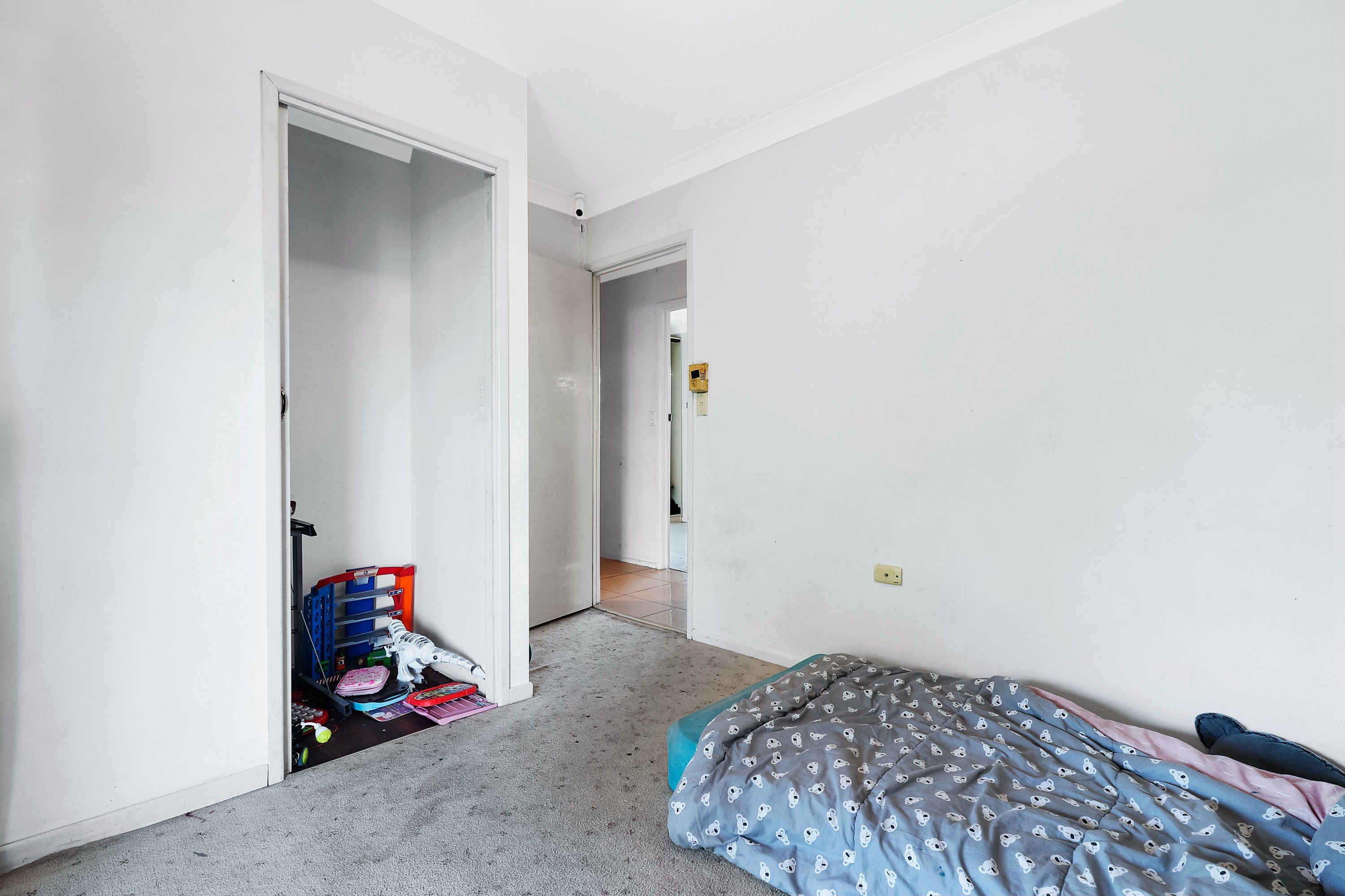 Positioned off the living area are a bathroom and three well-sized bedrooms with built-in storage, including one with air-conditioning and a second with balcony access.